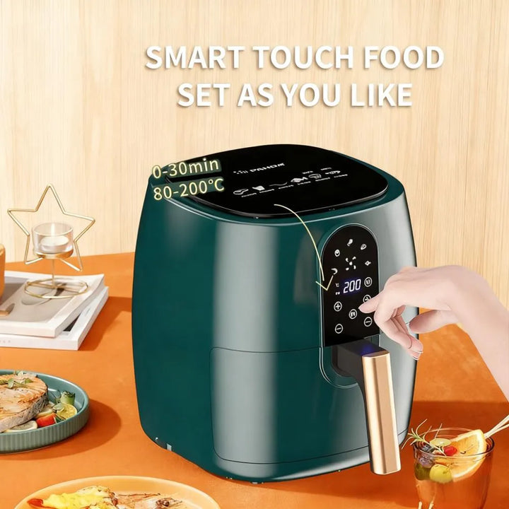 Discover a healthier way to cook with this 6L air fryer that uses hot air circulation instead of oil to prepare meals. By consuming significantly less fat than traditional deep fryers, it helps you create nutritious dishes. The spacious 6L multi-purpose air fryer is capable of cooking a wide variety of delicious foods including french fries, fried chicken, grilled fish, pizza, steak, and grilled wings. It features an intuitive LED touch screen and an automatic timing system for precise cooking control.